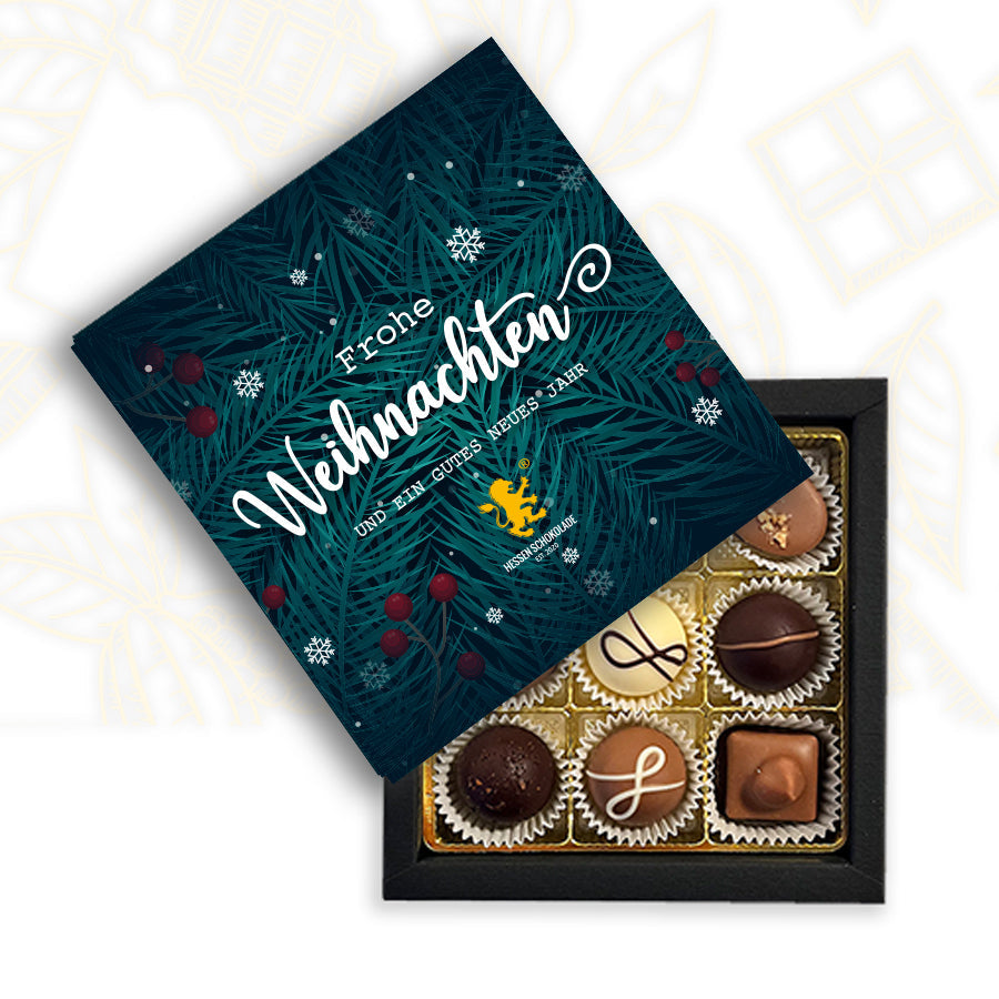 Diese Pralinen Variation ist als Firmenpräsent individualisierbar. Sie kann entweder in eine hochwertige Banderole mit ihrem Design gepackt werden – oder mit einer Siegelmarke mit ihrem Logo veredelt werden. Dies ist bereits ab 5 Boxen möglich. Sie haben Interesse? Sprechen Sie uns gerne an: hallo@hessen-schokolade.de