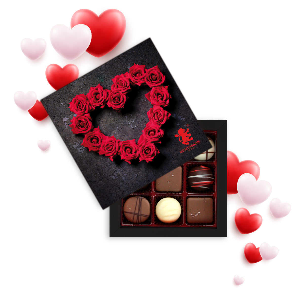 Füllung: 9 verschiedene Trüffel und Pralinen. Die Sorten der Pralinen und Trüffel variieren.