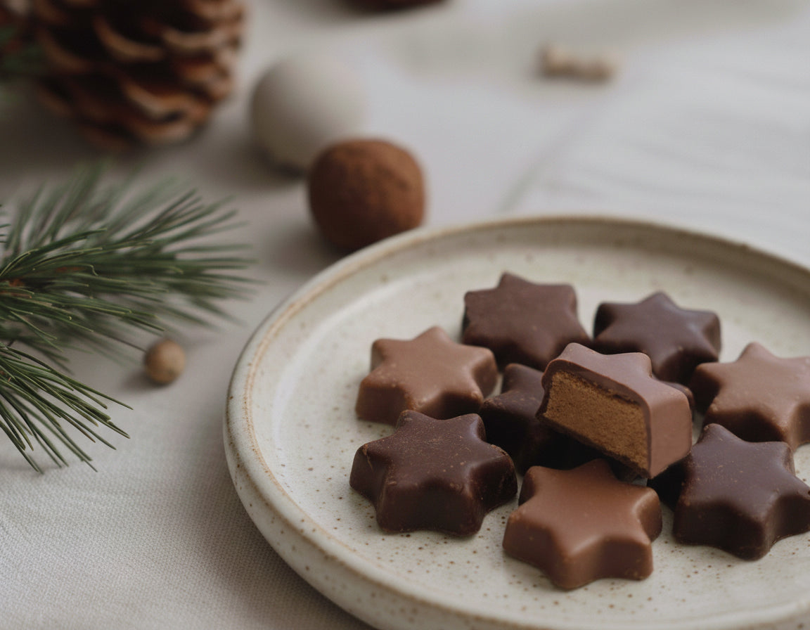 Ummantelt von edler Schokolade aus Kakaobutter und Kakaomasse entfalten die Sterne eine harmonische Balance aus herber Tiefe und sanfter Süße. Feine Noten von Zimt, Vanille und traditionellen Lebkuchengewürzen verleihen den Sternen eine festliche Würze, die an echte Weihnachtsbäckerei erinnert.