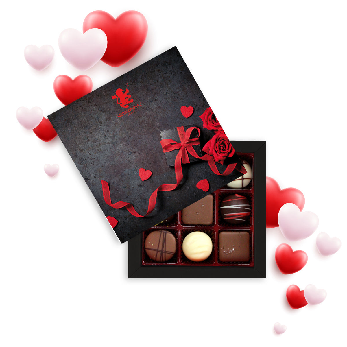 Füllung: 9 verschiedene Trüffel und Pralinen. Die Sorten der Pralinen und Trüffel variieren. Zutaten: Zucker, Kakaom...